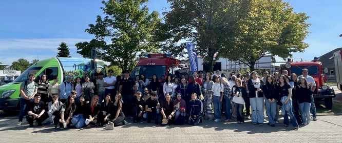 Der Treffpunkt war an der Fähre, von wo aus es für die rund 130 Schülerinnen und Schüler mit der Überfahrt nach Lemwerder und einem halbstündigen Fußmarsch weiter zur Feuerwehr ging. Teilgenommen haben die kompletten neunten Klassen 9A bis 9E mit insgesamt knapp 100 Schülerinnen und Schülern sowie weitere 30 Lernende aus Jahrgang 10. Mit 130 von insgesamt 310 angemeldeten Teilnehmenden stellte die Gerhard-Rohlfs-Oberschule fast ein Drittel aller Besucherinnen und Besucher.